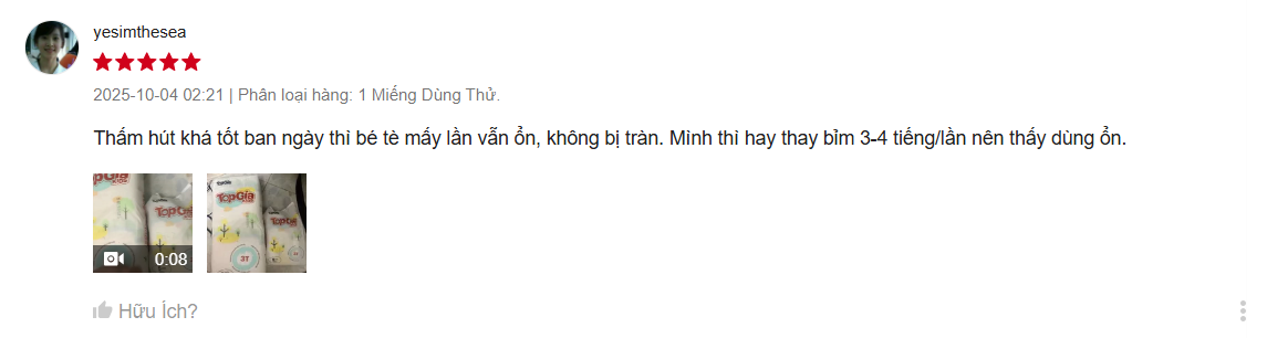yesimthesea: “Thấm hút khá tốt ban ngày thì bé tè mấy lần vẫn ổn, không bị tràn. Mình thì hay thay bỉm 3-4 tiếng/lần nên thấy dùng ổn.”