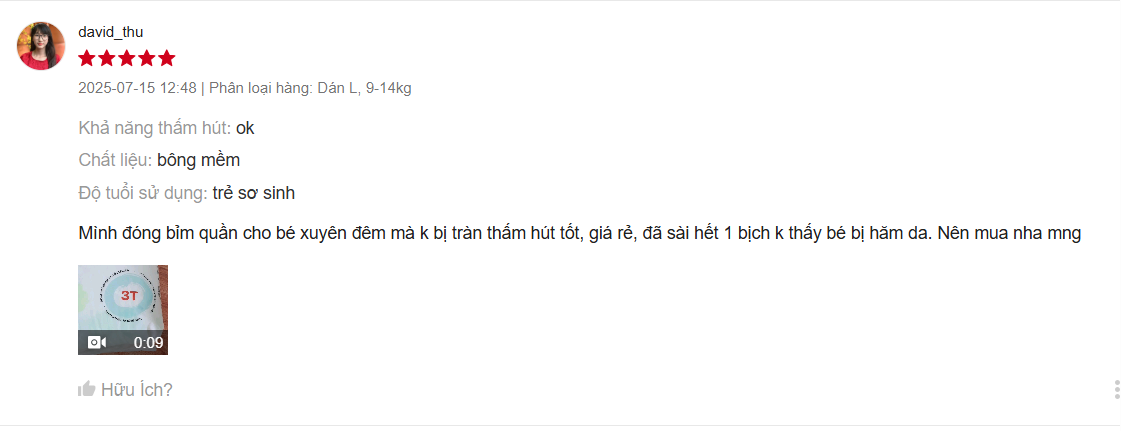 david_thu: “Mình đóng bỉm quần cho bé xuyên đêm mà không bị tràn thấm hút tốt, giá rẻ, đã sài hết 1 bịch không thấy bé bị hăm da. Nên mua nha mọi người”